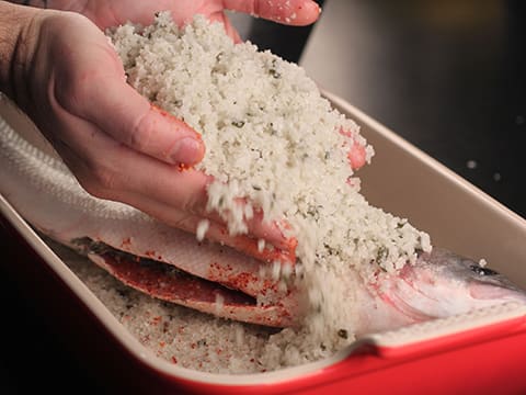 Une fois sorti du four, retirer la peau et les écailles en une seule fois à l’aide d’un couteau à bout rond et une cuillère à soupe.